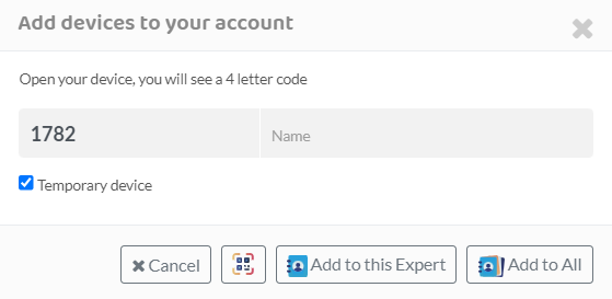 In the Remote Expert account on the PC, by pressing the button and enter the code and a name, the Operator device will be registered. Furthermore, the Expert can choose to add it to the current Expert account or all Expert accounts. Nevertheless, the Expert could add this device temporarily by checking in the box ¨Temporary Device¨. This new device will remain added until 0:00 Madrid Time, as long a call has not been made in the last 60 minutes.