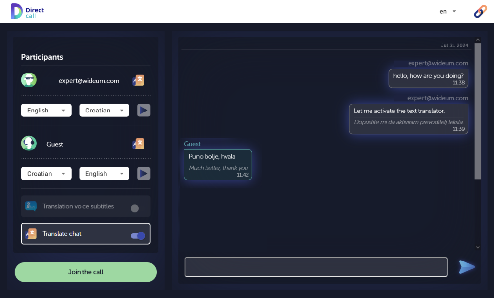 - The Expert can activate text translation by selecting the language into which the text is to be translated. For chat translation the source language is optional, if not typed the system identifies the source language automatically.