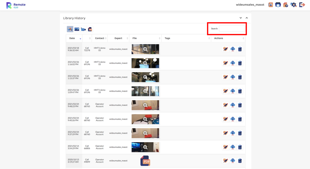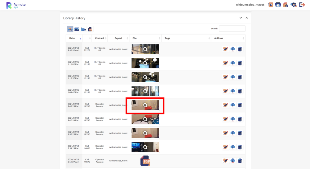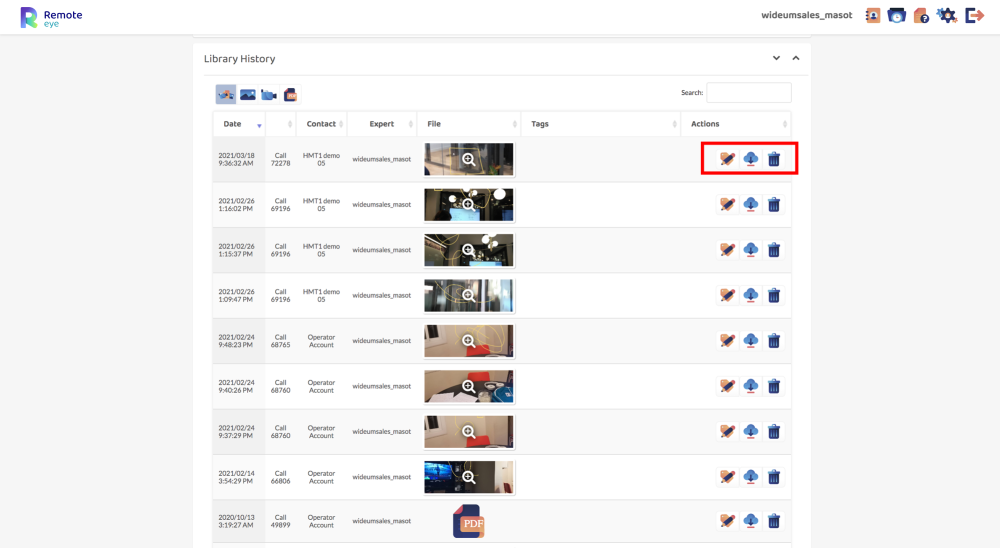 - L’esperto può eliminare, aggiungere un tag e scaricare i file nella colonna Azioni.
