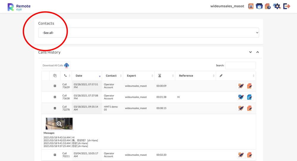 - Una volta che l’Esperto ha selezionato l’account dell’Operatore nel segmento dei contatti, verranno visualizzati tutti i file inviati a questo particolare operatore.