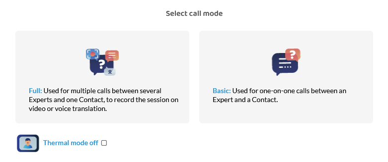 - Pieno: La comunicazione avviene tramite un server esterno. Offre maggiore stabilità nelle chiamate con più di un Esperto. Il server esterno può memorizzare le sessioni video. La modalità PIENO è consigliata per le sessioni che coinvolgono più di un esperto.